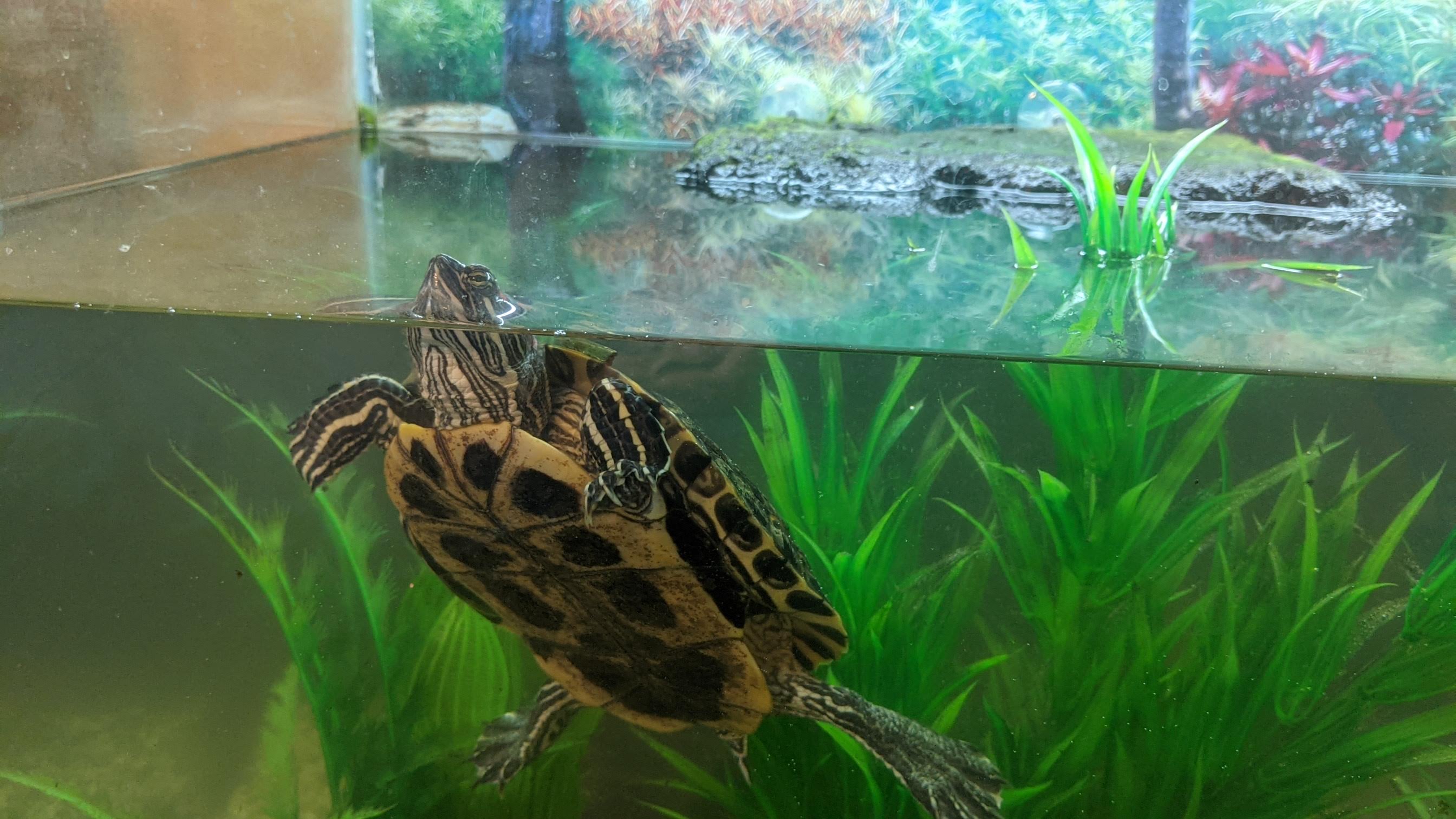 Teddy is my pet Red-Eared Slider turtle. He lives in a 50 gallon tank with some plants and a turtle dock to bask on. He is very defensive and always hisses at me, but when I feed him he always comes up to eat and isn't nervous at all. He just turned 4 on March 22nd 2021.